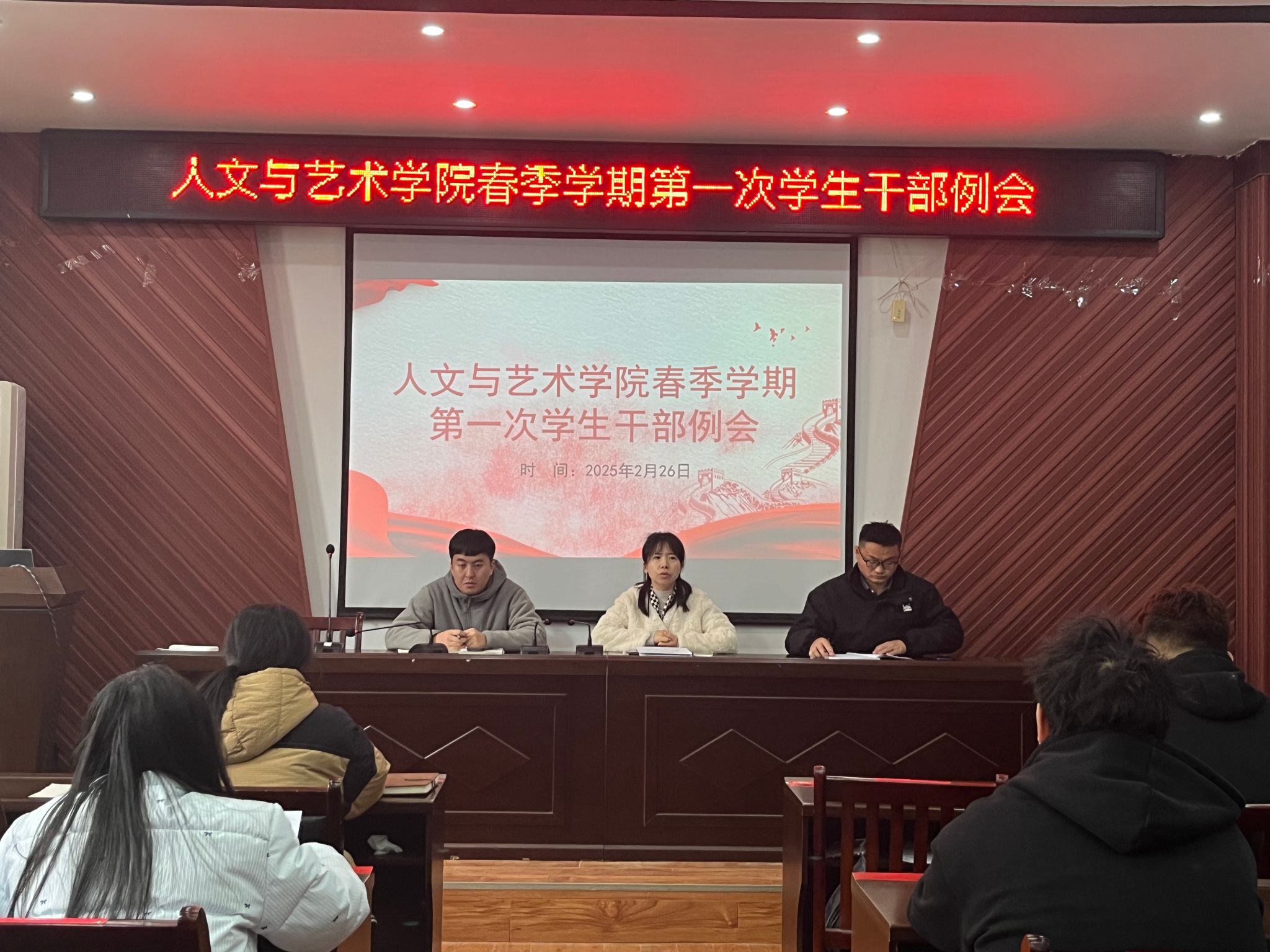 为进一步提升学生干部队伍的凝聚力和执行力,充分发挥学生干部在学院学生工作中的重要作用,2月26日,人文与艺术学院在艺术楼A230会议室召开2025年春季学期第一次学生干部例会,院团委书记、辅导员,团委学生会骨干和各部门负责人参加会议。