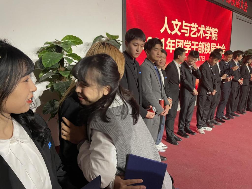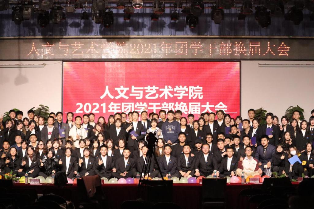 首先,由团委副书记丁蓓蒂介绍到场的嘉宾及会议流程。其次是18级学生会执行主席付衍博发言,回顾以往的工作状态,并分别对学生会工作进行总结,表达了对新一届学生干部的期望与嘱托。再次,19团委学生会主要学生干部代表谢可、卓长江、冯驰辉、武艺婷依次发表卸任感言,讲述自己的团学心路历程;接着,20学生会主席团成员新任学生干部代表赖金慧发表感想,表示定将不忘初,肩负起新一代团学干部的责任与担当。随后学院党委副书记王锐宣读2021年人文与艺术学院团委学生会主要学生干部的任命决定。然后全场观众及老师观看2021年团委学生会换届大会纪念视频。再然后丁蓓蒂为上一届团委学生会主要学生干部颁发聘书。最后领导老师和全体团委学生会干部上台合影留念。