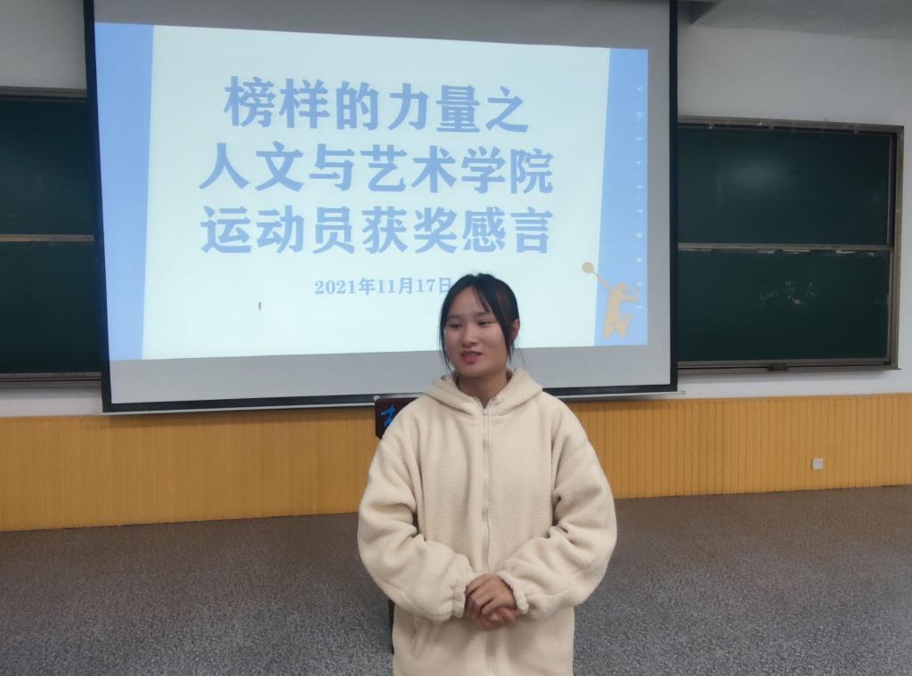 为深入学习先进典型、汲取榜样力量,发扬体育运动精神,人文与艺术学院于11月17日中午12:15在教学南大楼C105开展了运动员获奖分享交流会,人文与艺术学院团委副书记丁蓓蒂、辅导员黄一诺、张淑华出席此次会议,我院获奖运动员以及全体学生干部参加。