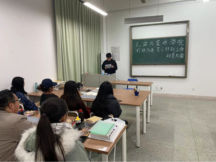 为提高学生校园安全防范意识,2021年11月12日上午,由人文与艺术学院辅导员黄一诺在艺术楼A320召开“打非治违”百日行动工作动员大会。