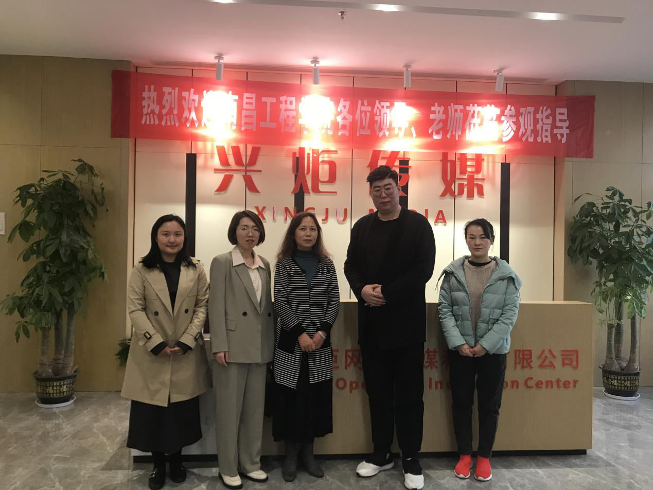 2023年3月10日下午,人文与艺术学院党委副书记王锐及数字与媒体艺术专业负责人刘焰、专业教师涂冠萍、辅导员张淑华,一行四人赴江西兴巨网络传媒科技有限责任公司进行考察调研。在江西省赣江新区管委会企业服务部刘军部长、公司代表的陪同下,学院一行首先参观了公司直播基地的直播间、演播室等场地,随后双方就产教融合、校企合作进行了深度交流。