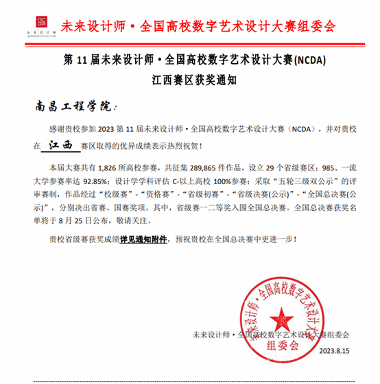 近日,第11届未来设计师·全国高校数字艺术设计大赛(NCDA)省赛、国赛奖项公布,我院参赛作品喜获省赛一等奖5项、二等奖9项、三等奖10项以及国赛一等奖1项、二等奖1项的佳绩。