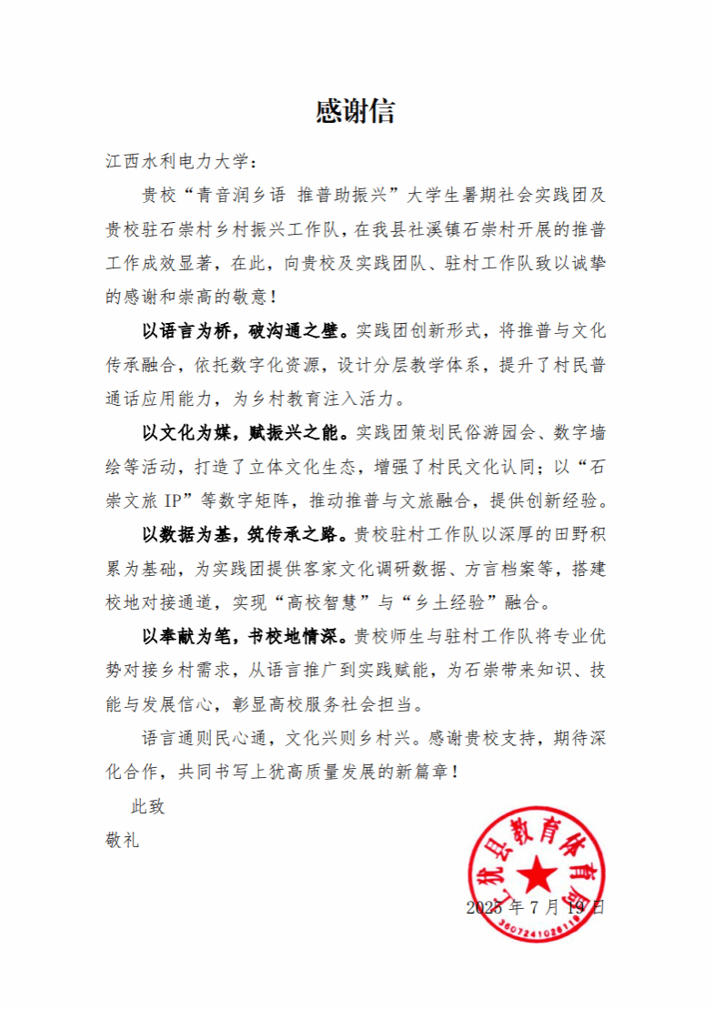 2025年7月19日,我校收到上犹县教育体育局发来的感谢信,对我校“青音润乡语 推普助振兴”大学生暑期社会实践团的工作成效给予高度肯定。