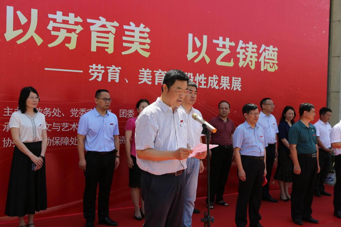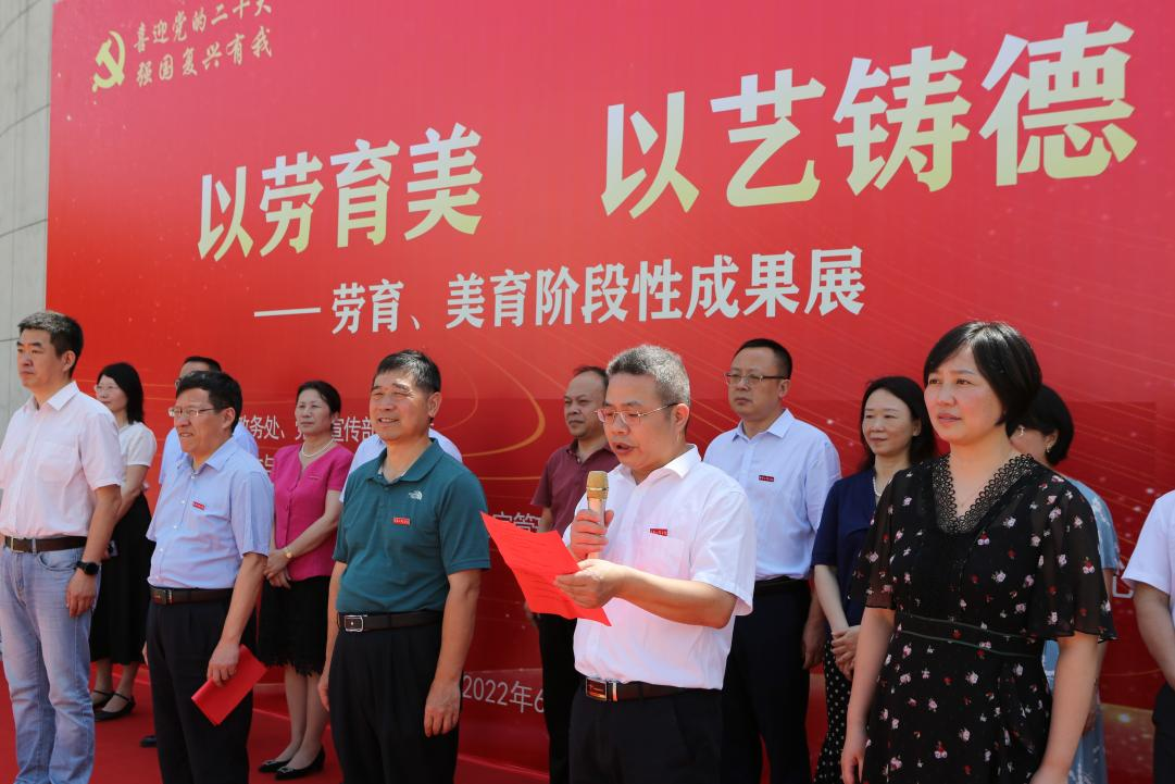6月8日,我校举办“以劳育美 以艺铸德”劳动教育、美育教育阶段性成果展,深入学习贯彻习近平新时代中国特色社会主义思想,落实党中央和总书记坚持立德树人要求,推动“德智体美劳”五育并举、提升校园文化建设品质,以实际行动迎接党的二十大胜利召开。此次展览由人文与艺术学院承办,全面展示学校“专业+”劳育、美育实践活动的阶段性成果。出席本次展览活动的校领导有:校长汪胜前、副书记吴泽俊、副校长李培生、纪委书记殷安全、副校长周敏丹、副校长陆伟锋。纪委书记殷安全主持开幕式,副校长陆伟锋发表讲话,校长汪胜前宣布展览开幕。教务处、党委宣传部、工会、团委、学生工作部(处)、资产与实验室管理处、后勤保障处、保卫处、教育教学评估中心等部门负责人以及人文与艺术学院50名师生代表参加活动。