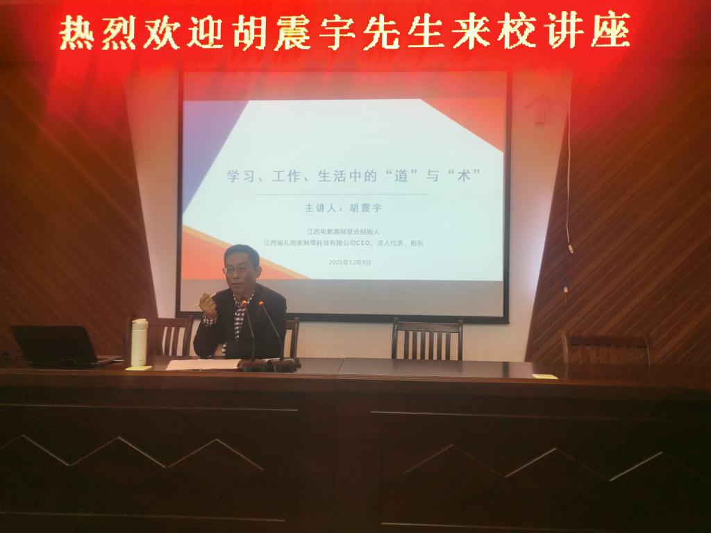12月9日,江西电影票网联合创始人、江西福礼到家网络科技有限公司CEO、法人代表胡震宇先生应人文与艺术学院邀请在艺术楼A231会议室做了“学习、工作、生活中的‘道’与‘术’”的主题讲座,数字媒体艺术教研室部分专业教师和学生聆听了讲座。