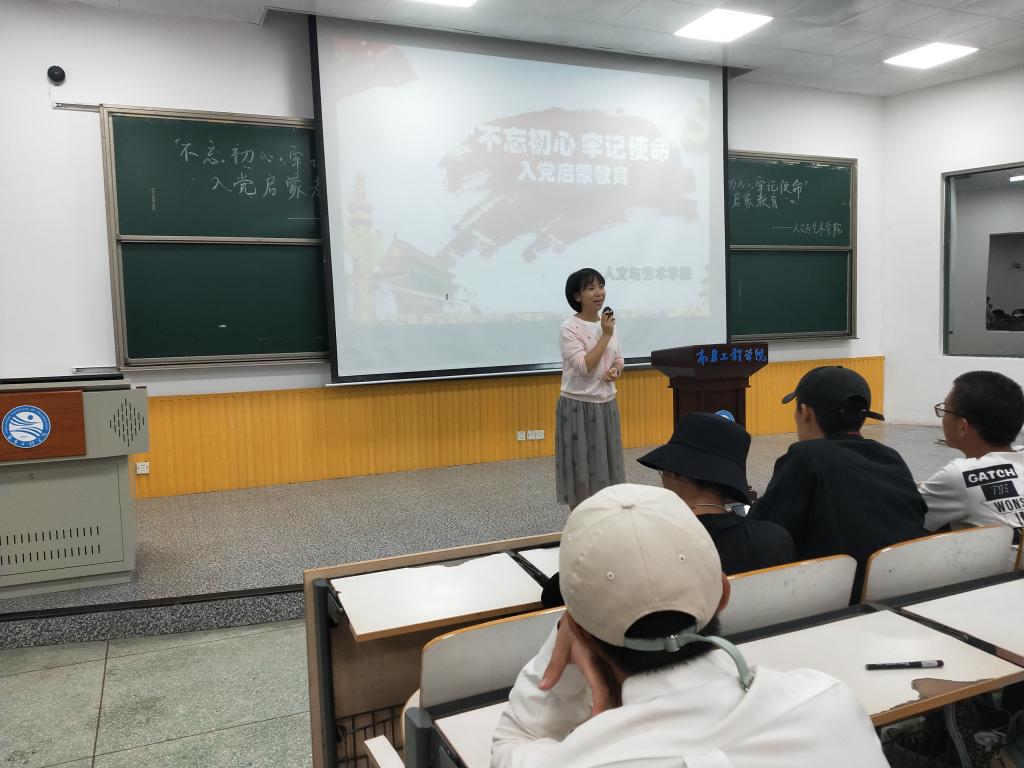 9月23日晚7:00,人文与艺术学院于南教学楼c105开展“不忘初心、牢记使命”2019级新生入党启蒙教育讲座。讲座旨在让新生更好地学习党的基本章程,了解入党条件和入党程序,鼓励新生积极地向党组织靠拢。人文与艺术学院组织员、第一学生党支部书记丁蓓蒂,副书记陶勇,党员代表校教官队副团长薛珂珂,各学生党支部委员代表及19级全体新生参加了讲座。
