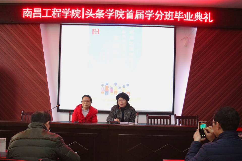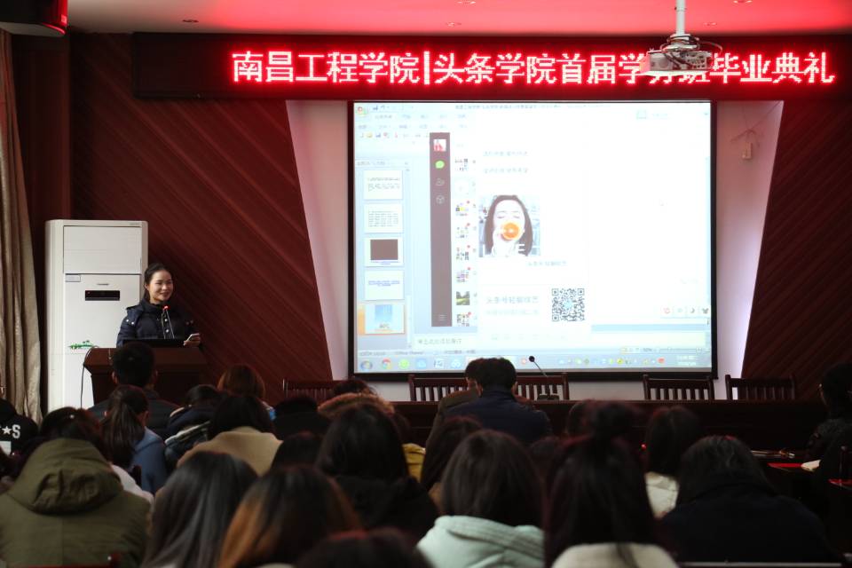 典礼上,张记刚老师首先介绍了南昌工程学院头条学院首届学分班总体情况:我校共有来自编辑出版学、广播电视学、数字媒体艺术等专业51名同学参加了首届学分班的学习,先后有17位来自今日头条、人民大学新闻学院、刺猬公社、NEWMEDIA新媒体联盟等学界专家和业界大佬通过在线的形式为学员授课。最终我校有29名同学通过问答、图文和视频阶段的学习、实战和考核,取得了含金量极高的“头条学院新媒体训练营”毕业证书和校内2个学分,通过率达到56.8%,远高于全国30%的平均水平。其中来自2014级广播电视学专业的陈运梅同学多项数据排名全国第一,获得“头条学院学分班优秀学员”荣誉称号;来自2015级编辑出版学、2016广播电视学专业的张庆娜、陆晓城、陈雪、;吕小倩等15位同学获得“南昌工程学院学分班优秀学员”荣誉称号。