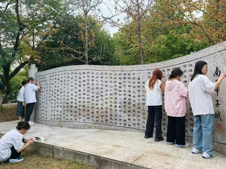 活动中,青年们热情高涨,分工明确,协作无间。他们手持工具,精心调配染料,细致入微地为褪色的石壁文字重新描摹,使其重焕墨香,每一处细节都凝聚着同学们对校园的爱护与责任。经过数小时的辛勤努力,多个校园景观节点焕然一新,重现往日光彩,为校园增添了几分温馨与雅致。