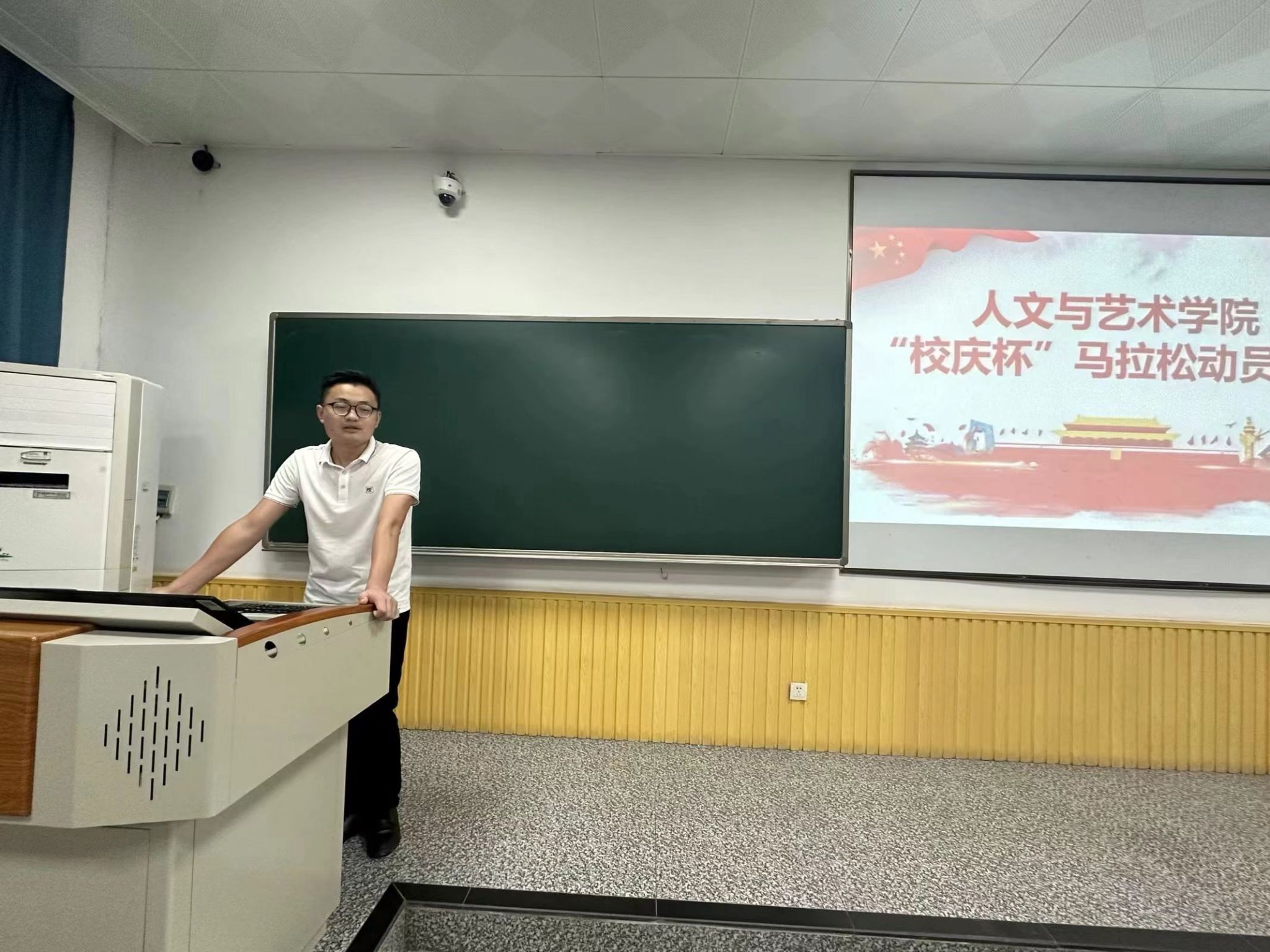 为庆祝南昌工程学院成立65周年,我校举办首届“校庆杯”马拉松大赛,这吸引了众多老师学生的参与。人文与艺术学院于2023年11月4日在南教学楼C103召开了“校庆杯”马拉松大赛动员大会,本次大会由辅导员兰龙焱和辅导员马浩哲主持,参会人员有人文与艺术学院的各团学干部及参赛运动员。会上,首先由兰龙焱对积极参与此次“校庆杯”的同学表示鼓励和赞扬。