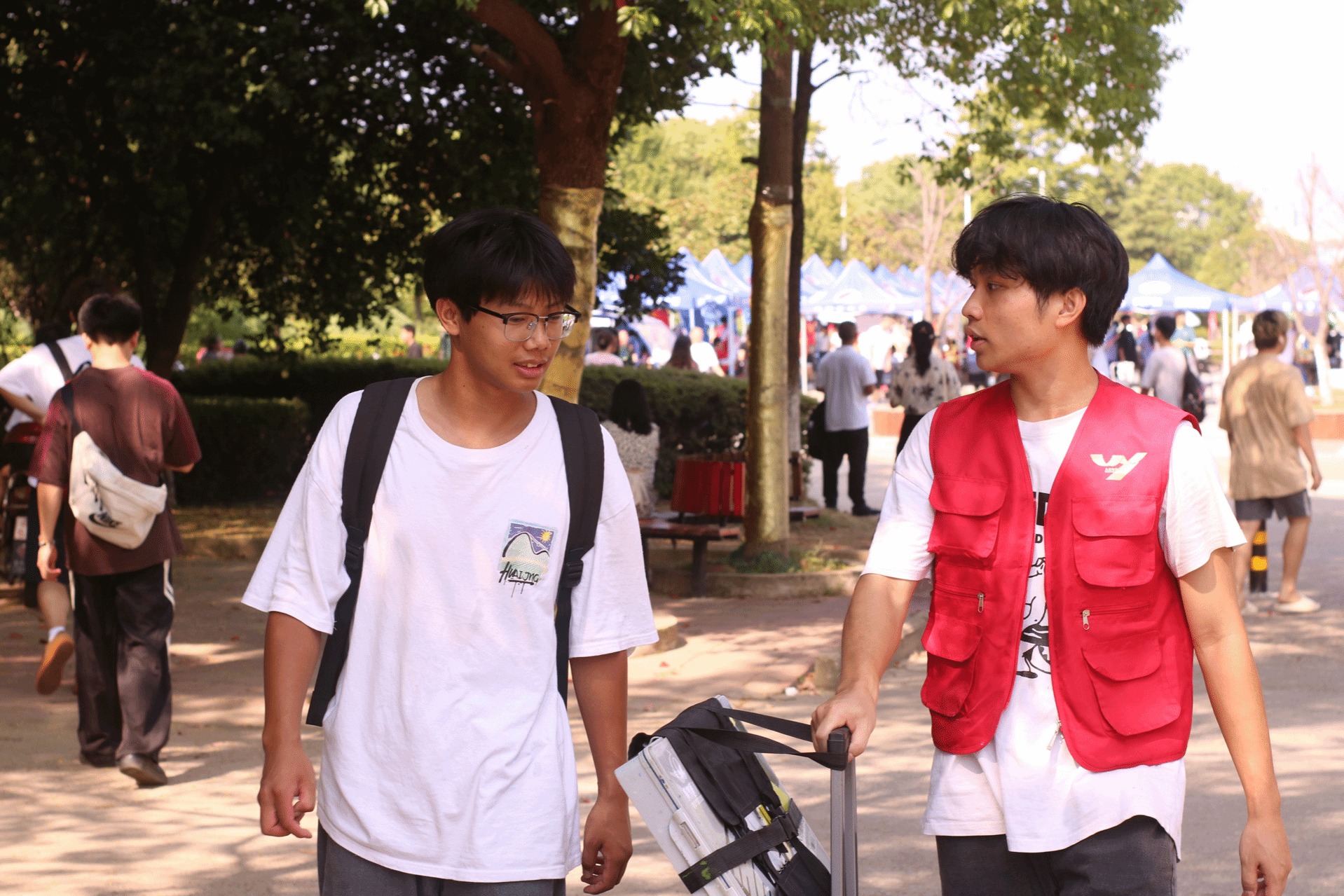 9月5日,我院的迎新工作正式拉开帷幕。志愿者们身着统一的红色马甲,手持欢迎横幅站在迎新点,用灿烂的笑容迎接每一位新生的到来。在迎新点,他们主动上前,热情地帮助新生搬运行李,减少新生的负担,让他们能够更加轻松地入住宿舍。在报到处,志愿者们负责协助新生完成注册报到流程,包括核对个人信息、发放宿舍钥匙、领取校园卡等,确保新生能够顺利完成入学手续。在新生们对新环境充满好奇和疑问时,志愿者们耐心地解答新生关于课程、社团、校园生活等方面的问题,帮助他们快速适应大学生活。志愿者们不仅在迎新现场忙碌,还积极参与了学院组织的一系列迎新活动。艺术市集等活动的开展让新生们在第一时间感受到学院浓厚的人文氛围和艺术气息。
