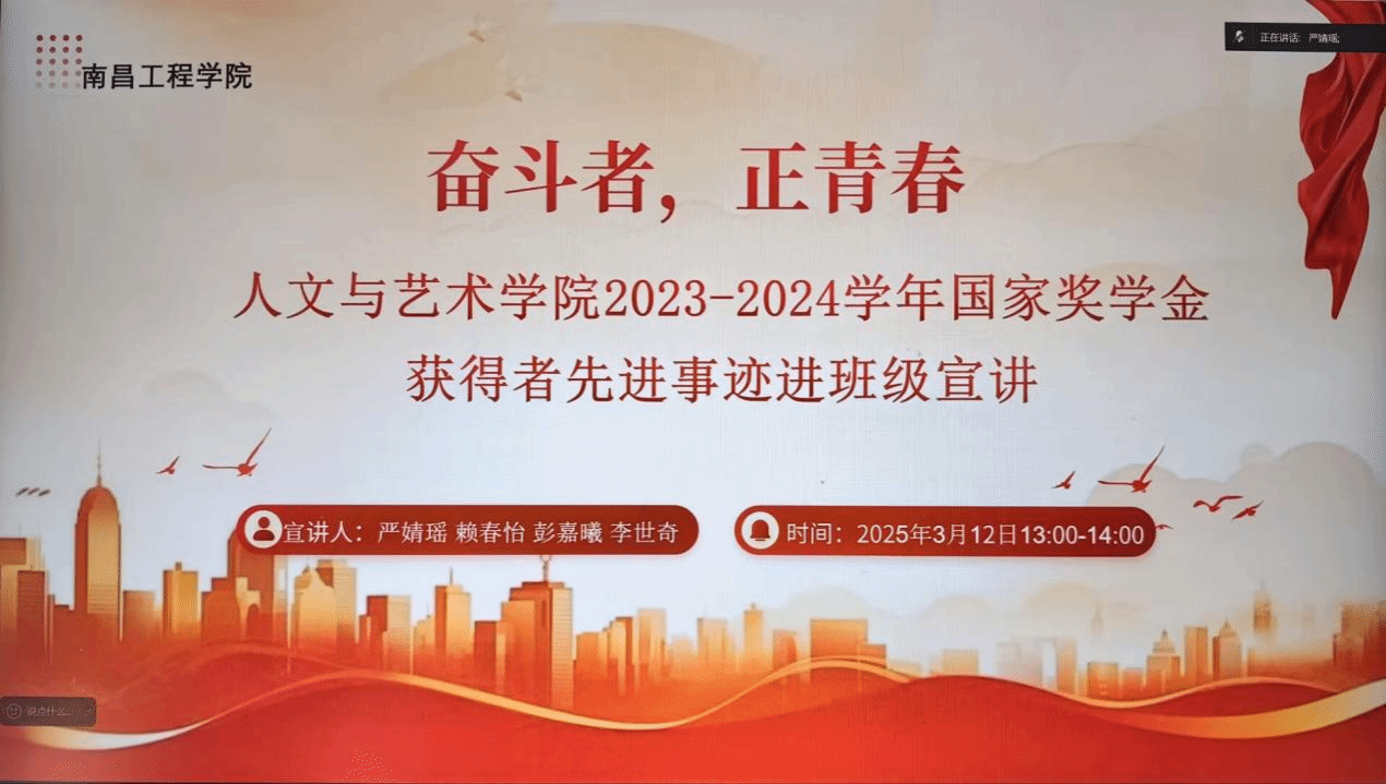 3月12日中午,人文与艺术学院通过线上会议的形式开展了"奋斗者·正青春"国家奖学金获得者宣讲会。学院辅导员、4位2023-2024学年国家奖学金获得者及全体大一新生参加。