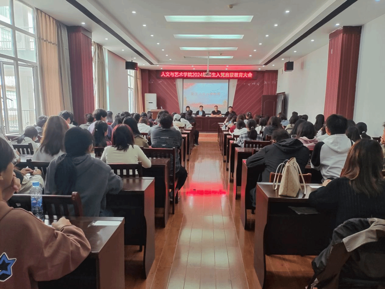9月22日中午,人文与艺术学院于艺术楼A230召开2024级新生入党启蒙教育大会,学院党委副书记黄海平、学生党支部书记蒿佳杭、兰龙焱、马浩哲及全体2024级团员参加了会议。